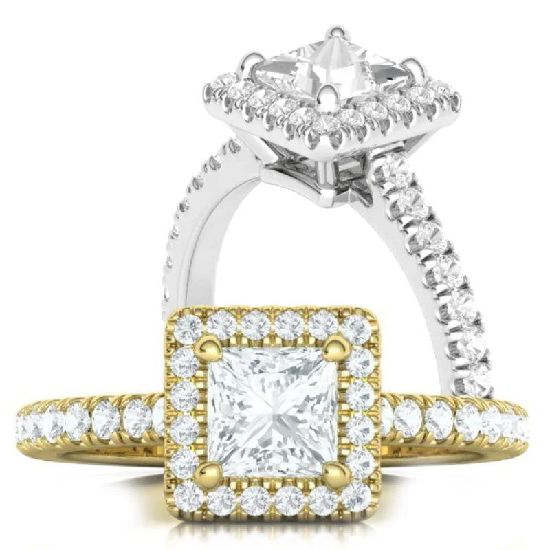טבעת יהלום מרובע בחיתוך פרינסס בסגנון סוליטר היילו (HALO) שורת יהלומים מסביב לאבן המרכזית