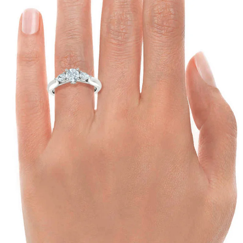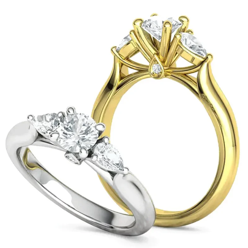 טבעת שלוש יהלומים טיפה – טבעת אירוסין 3 אבנים עם יהלום מרכזי בחיתוך עגול ו-2 יהלומים צדדיים בחיתוך טיפה