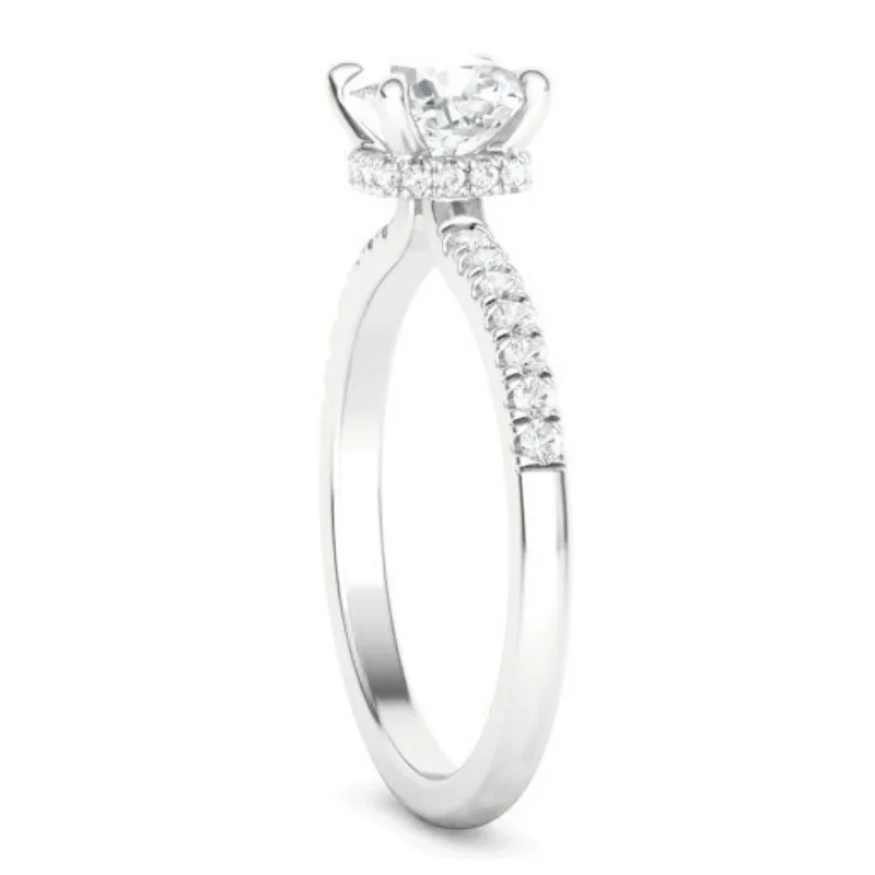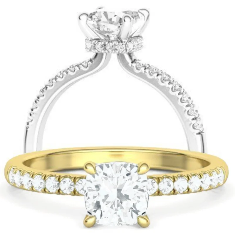 טבעת אירוסין יהלום קושן היילו שורת יהלומים נסתרת מתחת לאבן המרכזית בעיצוב סוליטר קלאסי