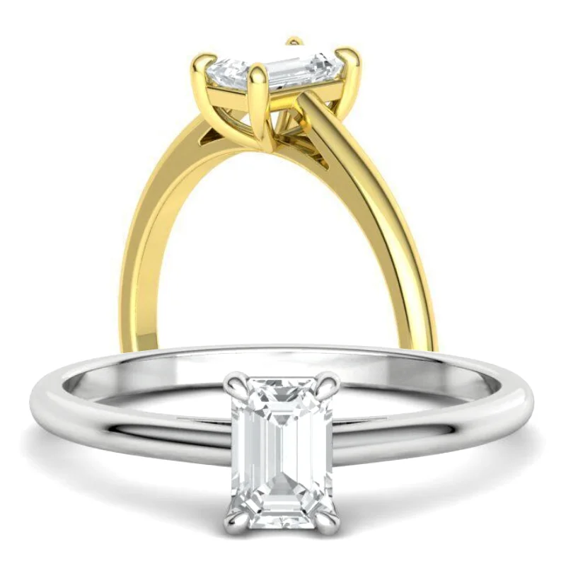 טבעת יהלום בחיתוך אמרלד מלבני בסגנון סוליטר 4 שיניים דקה ועדינה