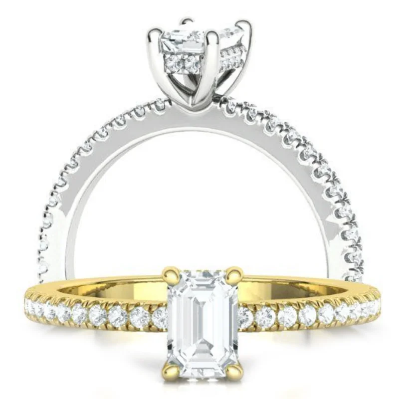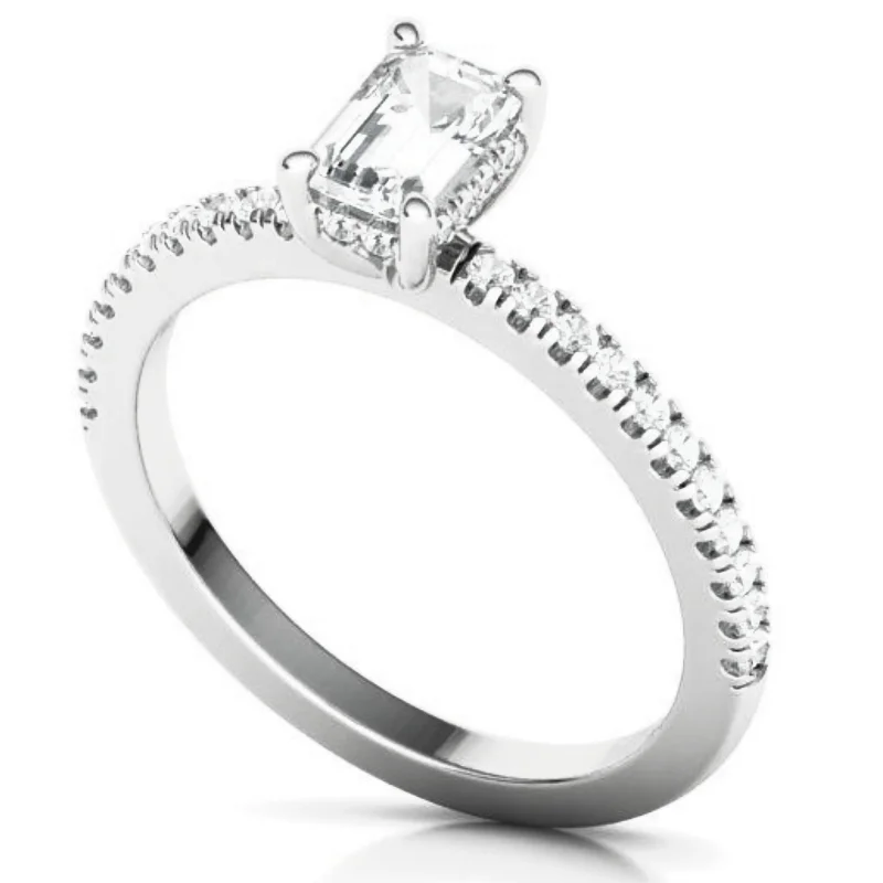 טבעת יהלום אמרלד קאט עיצוב סוליטר קלאסי עם שורת יהלומים מתחת לאבן המרכזית