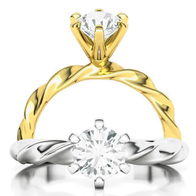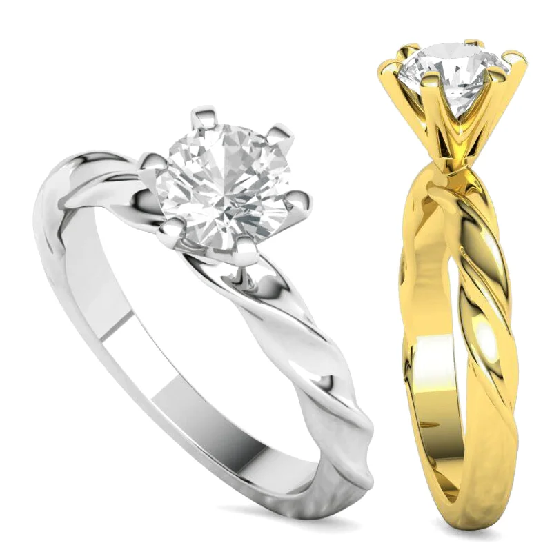 טבעת אירוסין סוליטר עם פס מפותל – אבן יהלום בודדת במרכז, והפס של הטבעת ("שנק" או "בנד") מעוצב בפיתול