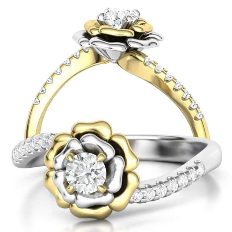 טבעת שושנה משובצת יהלום לבחירה 2 גווני זהב בעיצוב טוויסט משובצת אבני צד ושיבוץ מרכזית ארבע שיניים מסורתי