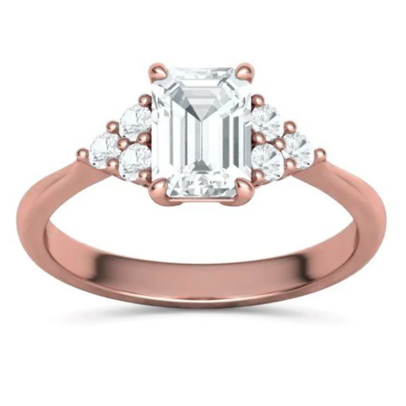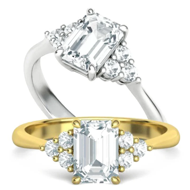 טבעת יהלום אמרלד וינטאג' סוליטר קלאסית עם 3 יהלומים יהלומים מכל צד