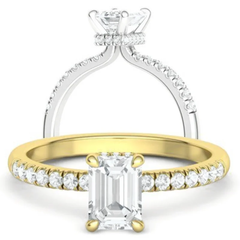 טבעת יהלום אמרלד סוליטר קלאסית ארבע שיניים משובצת יהלומי צד והילה נסתרת (שורת יהלומים מתחת לאבן המרכזית)